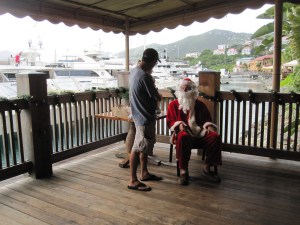 In early December, Santa began appearing all over the island. We first saw him arrive by golf cart at the tree lighting ceremony at the outdoor Havensight Mall (next to where the cruise ships dock). The first 1,000 children to walk by him got a gift; BB and BG want nothing to do with the big man in red yet, so we checked him out from afar. (I explained to BG how all these ‘Santas’ were really his cousins, sent from the North Pole to do research and prep-work). It was a crowded and energetic evening affair with beautiful steel pan Christmas Carols (performed by kids!) and much more entertainment afterward, but babies needed bed. A skinnier Santa in boat shoes showed up several days later at the neighboring outdoor Yacht Haven Grande Mall (the one with Gucci, Vuitton, and Ferragamo, among other shops) waiting for tiny shy children to approach him on his folding chair. This was a quieter daytime affair with caroling; a rainy morning perhaps scared off more people, but a sweet family day out regardless. Subsequent Santas (which we skipped for one reason or another) seemed everywhere on all manner of conveyances: there was one at the Belgian Chocolate Factory downtown (he probably drove); another Santa arrived by dinghy at the American Yacht Harbor and sat on the terrace near the Island Lattes coffee shop; yet another came to the Rotary Club breakfast at Eudora Kean High School riding a red fire truck. Politico Santa showed up to a children’s Christmas Party hosted by Governor and First Lady deJongh in downtown Emancipation Square via coattails (sorry, couldn’t resist). The final Santa that I know about will arrive Friday at the Yacht Club – I can only wonder how he gets there. Sloop?