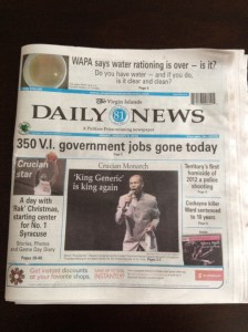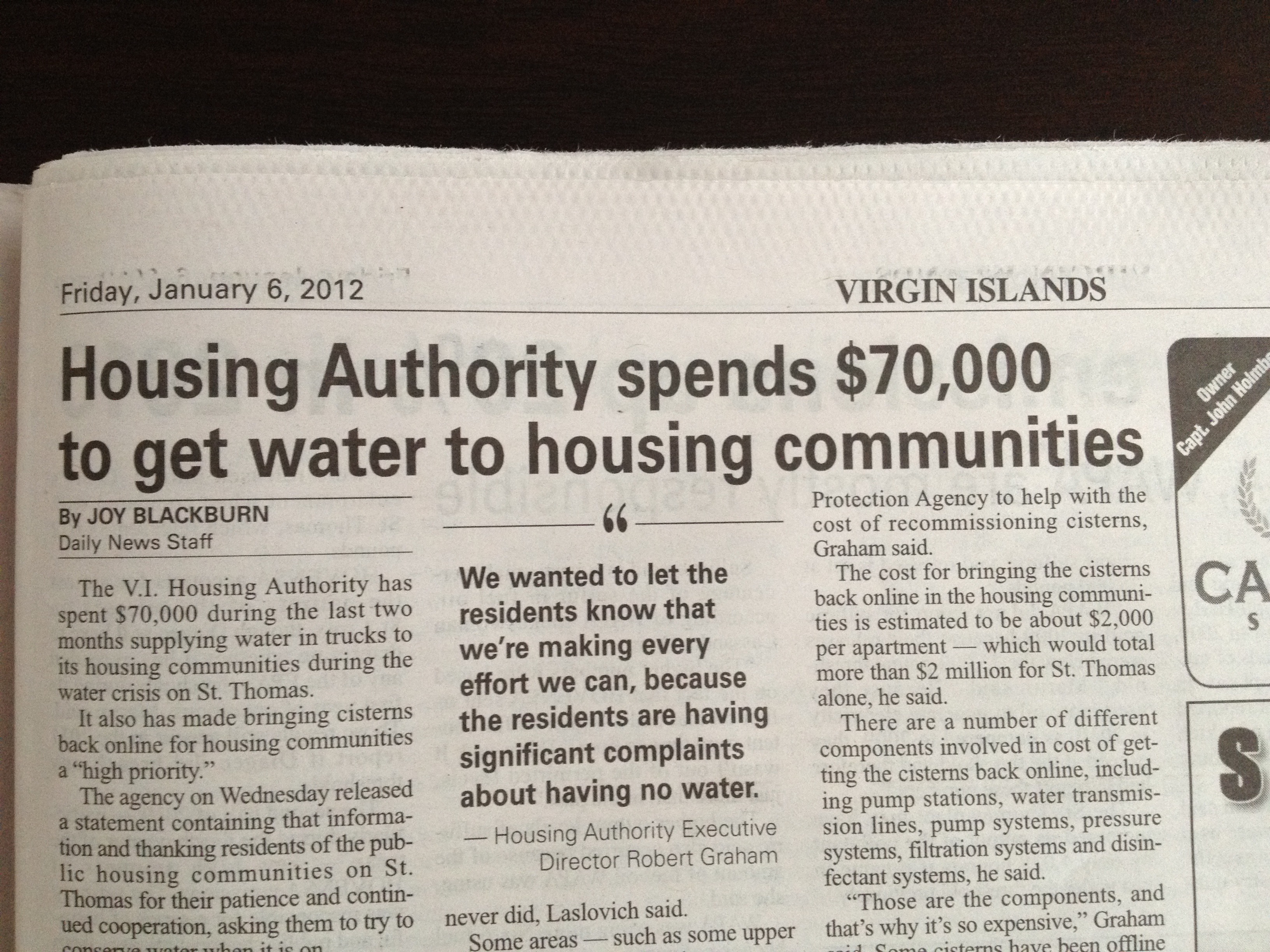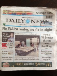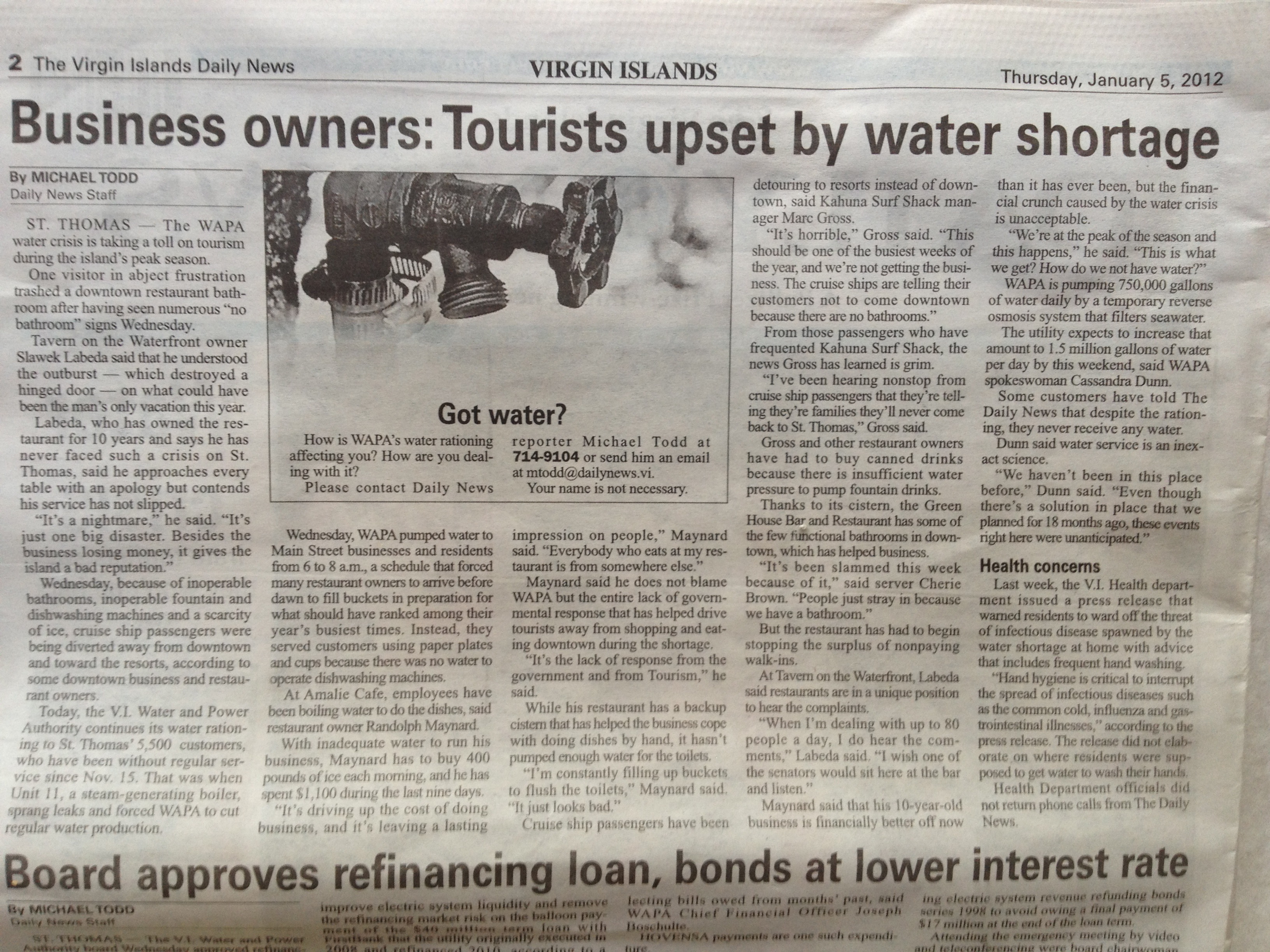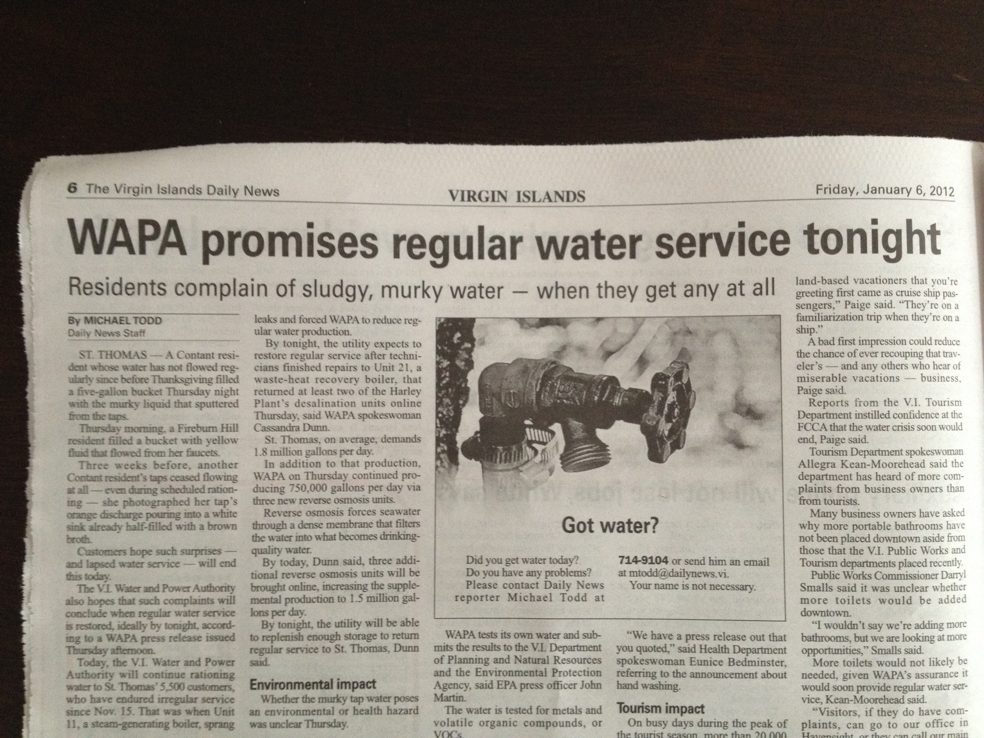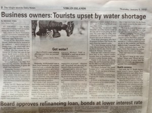 There has been a massive water shortage since November 15th on St. Thomas and St. John for homes, businesses, hotels, and schools connected to town water; hence the water truck we had never seen before from St. John. We are very lucky where we live because it has a reverse-osmosis system that turns seawater into useable water (there are a couple of these on the island, and WAPA is trying to set up more quickly), but if you venture out, places might be shut due to lack of water, and bathrooms are either closed, or ‘number 1 only.’ Some tourists have not been at all sympathetic or even appreciative of the fact that they are using a precious commodity while they are on island. The newspaper even reported terrible behavior with people trashing bathrooms or saying they will never come back. Good riddance. Be thankful today when you use water to flush toilets and turn on a faucet. We are.
