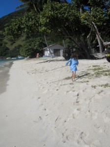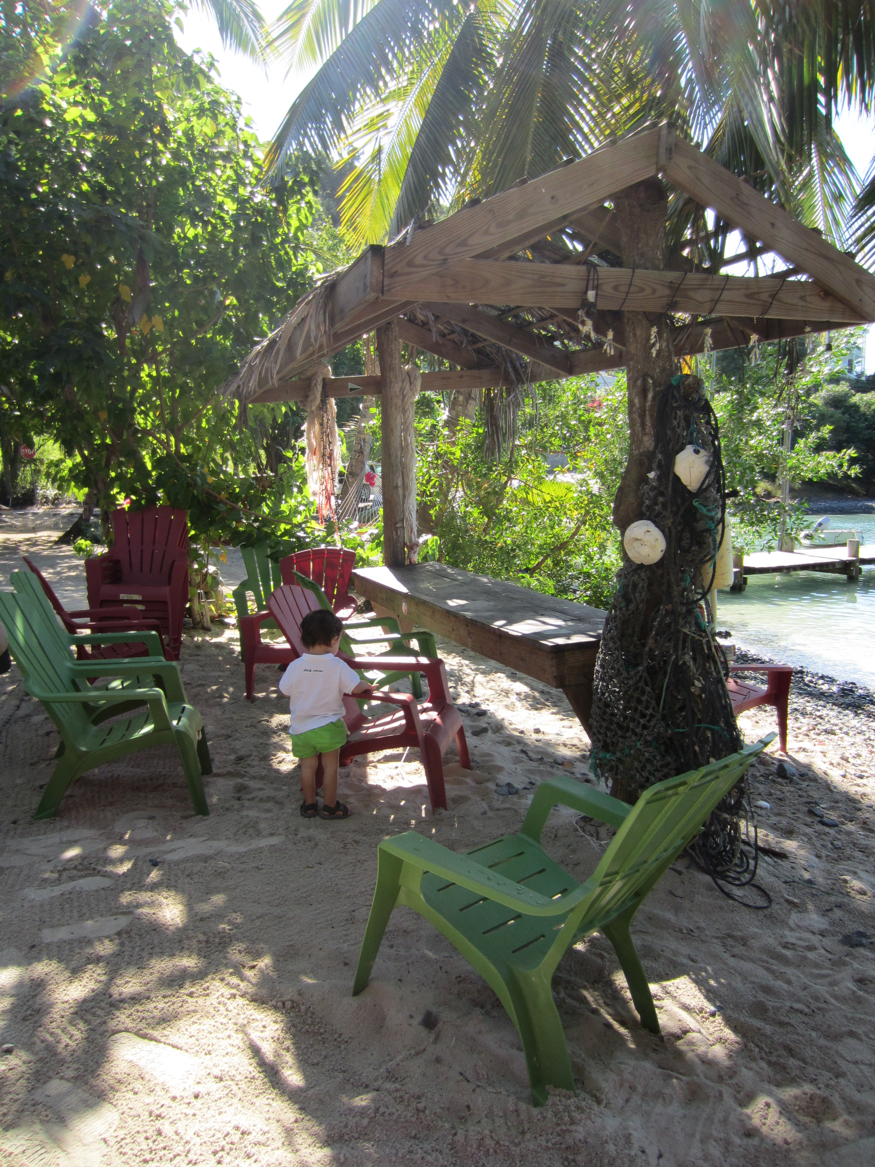 We cleared customs, sat at Foxy’s, listened to Foxy himself strum the guitar, and sipped Painkillers. I don’t care what time it is – when in Rome…though the Babies had pineapple juice. BB found a brand new spin on his favorite activity of throwing rocks into the water: he would throw them, a very friendly playful black lab would bound into the water and try to catch them, then wait for BB to throw another. Seriously, it could have been hours of entertainment for both Baby Boy and Dog – I wanted to take the dog home with us. BG discovered an empty hammock stretched between two palm trees overlooking the rock-throwing, so she amused herself climbing, swinging, and watching pelicans dive for fish. Mother and Sister fell in love with the Painkillers and spent the next week trying to recreate the perfect Painkiller. There are all sorts of different recipes on-line, and as a result, when they left I inherited the most random tropical selection of drink ingredients ever. It is quite difficult to recreate Foxy’s, though they did a masterful job.