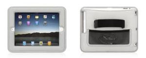 The iPad, with the most important accessory - the car seat strap holder thingie. Not only can you use it in a car, but you can wrap that strap around heavy table centerpieces, around chair backs, etc. etc.