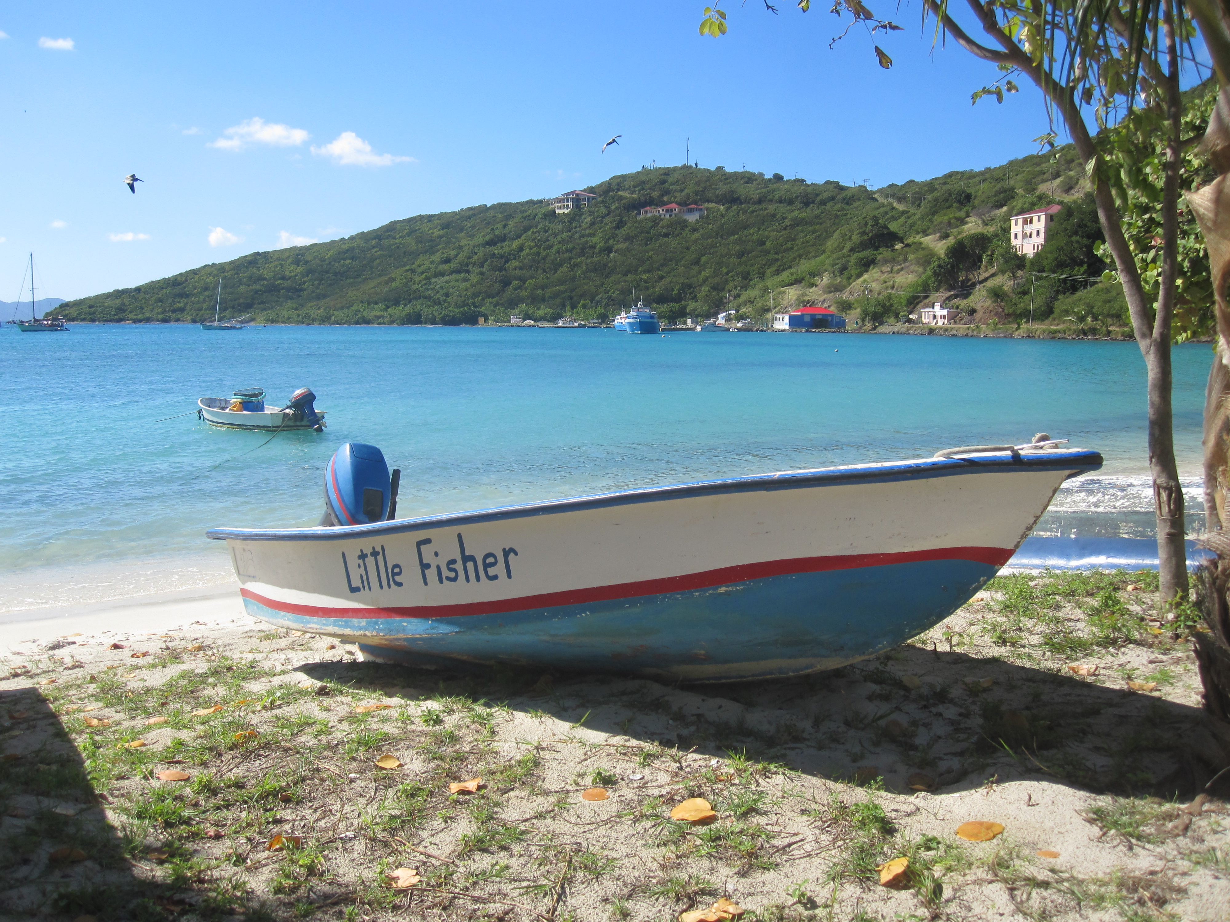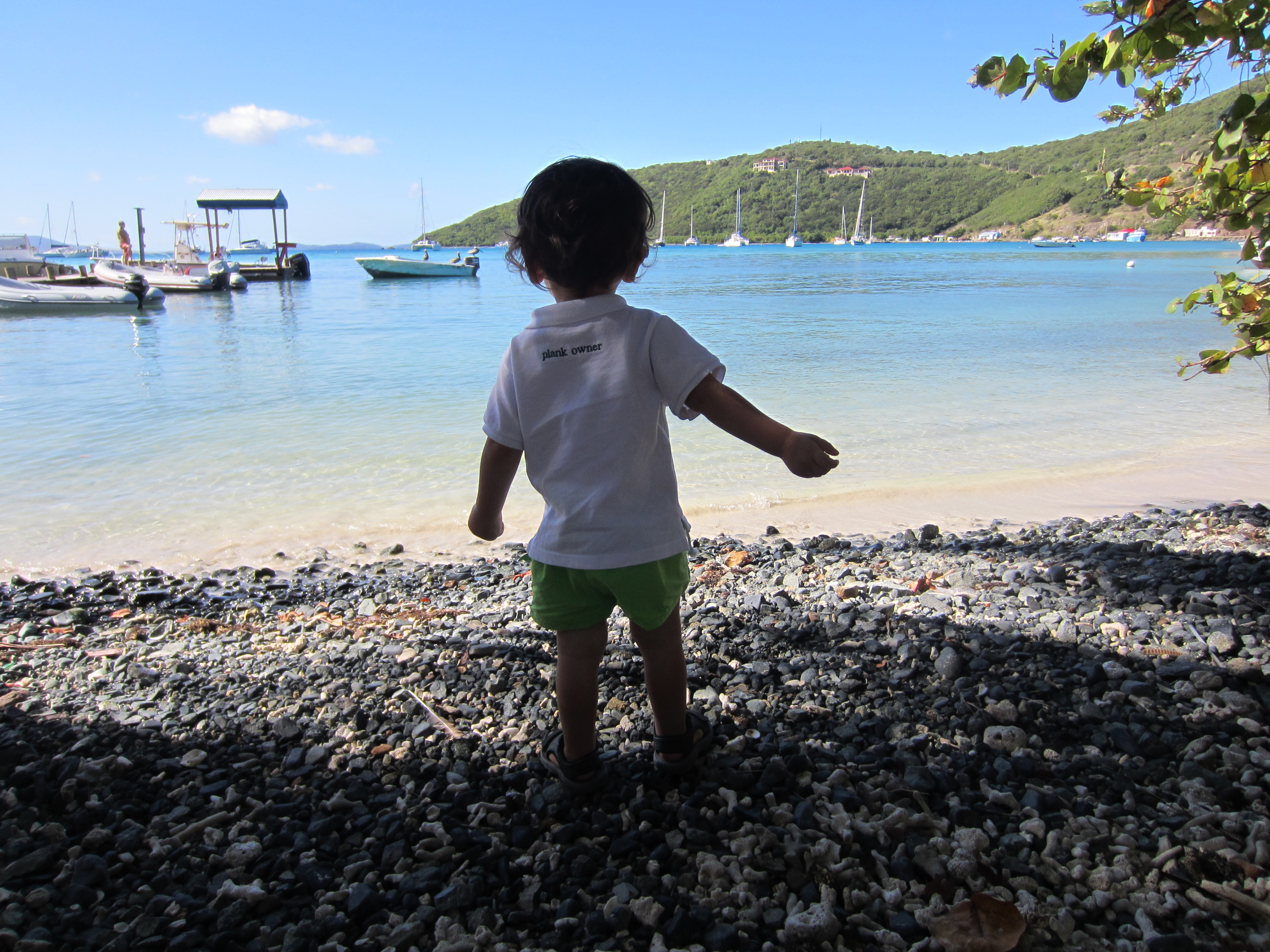 Captain Ocean Peterson picked the six of us up (Husband, Babies, visiting Mother and Sister, and me) at the dock at 8:30am in the chartered motorboat; he was taking us out for a day tour around the neighboring British Virgin Islands (BVI). We had been out on a boat several times before with the babies, so I managed not to pack eight billion bags of ‘just-in-case’ stuff for them this time. One still needs diapers, wipes, snacks, sippy-cups, life vests, dry clothes, sunscreen and towels with two little ones, just not several bags of each. Of course I am sure we could have managed without half that, but in my experience, the minute you don’t have something, you need it (the chances that someone will have diapers in your child’s size – or at all, for that matter – at a restaurant reachable only by boat are pretty slim). And, I am almost ashamed to admit that we try never to leave home without our iPad when there is a meal involved. Almost.
