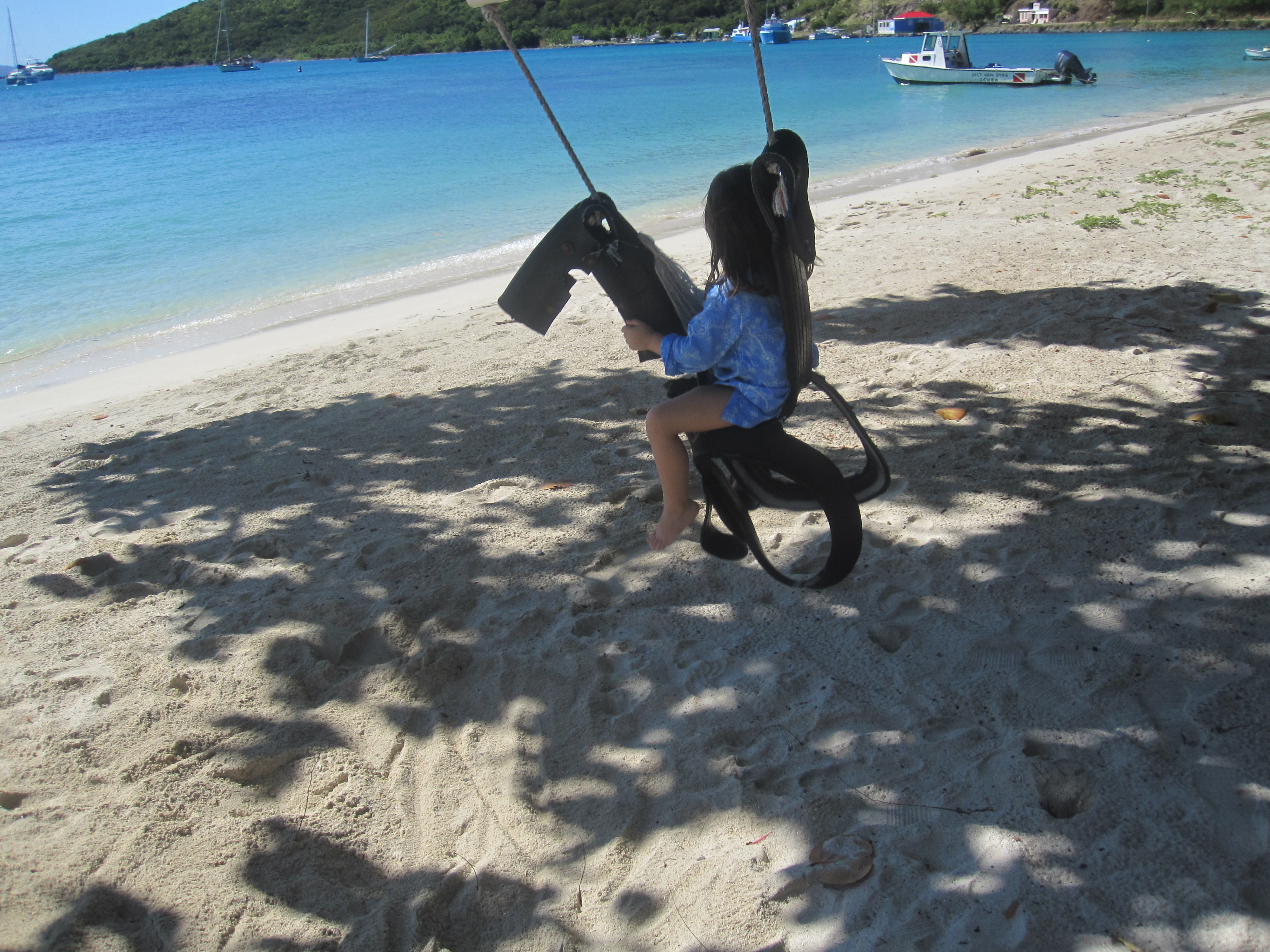 Sister and I then took a walk down the beach to the other end of the main beach/street, and happened upon a cool tire swing shaped like a horse. We went back to get BG (BB not being a fan of swings) and ran her back there. She was in absolute heaven. It was time to go soon after, and back on the boat we went…